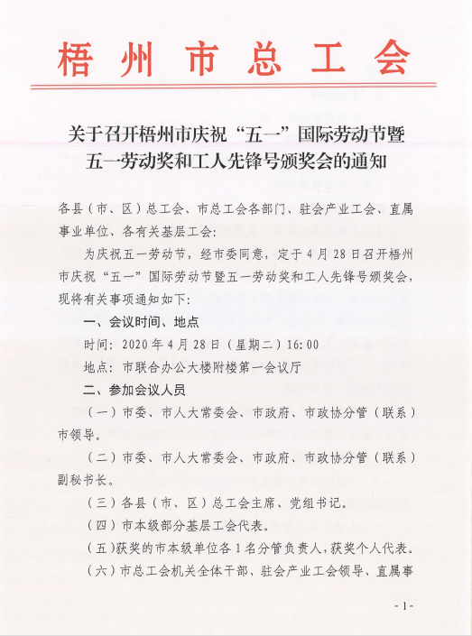 關(guān)于召開梧州市慶?!拔逡弧眹H勞動(dòng)節(jié)暨五一勞動(dòng)獎(jiǎng)和工人先鋒號頒獎(jiǎng)大會(huì)的通知