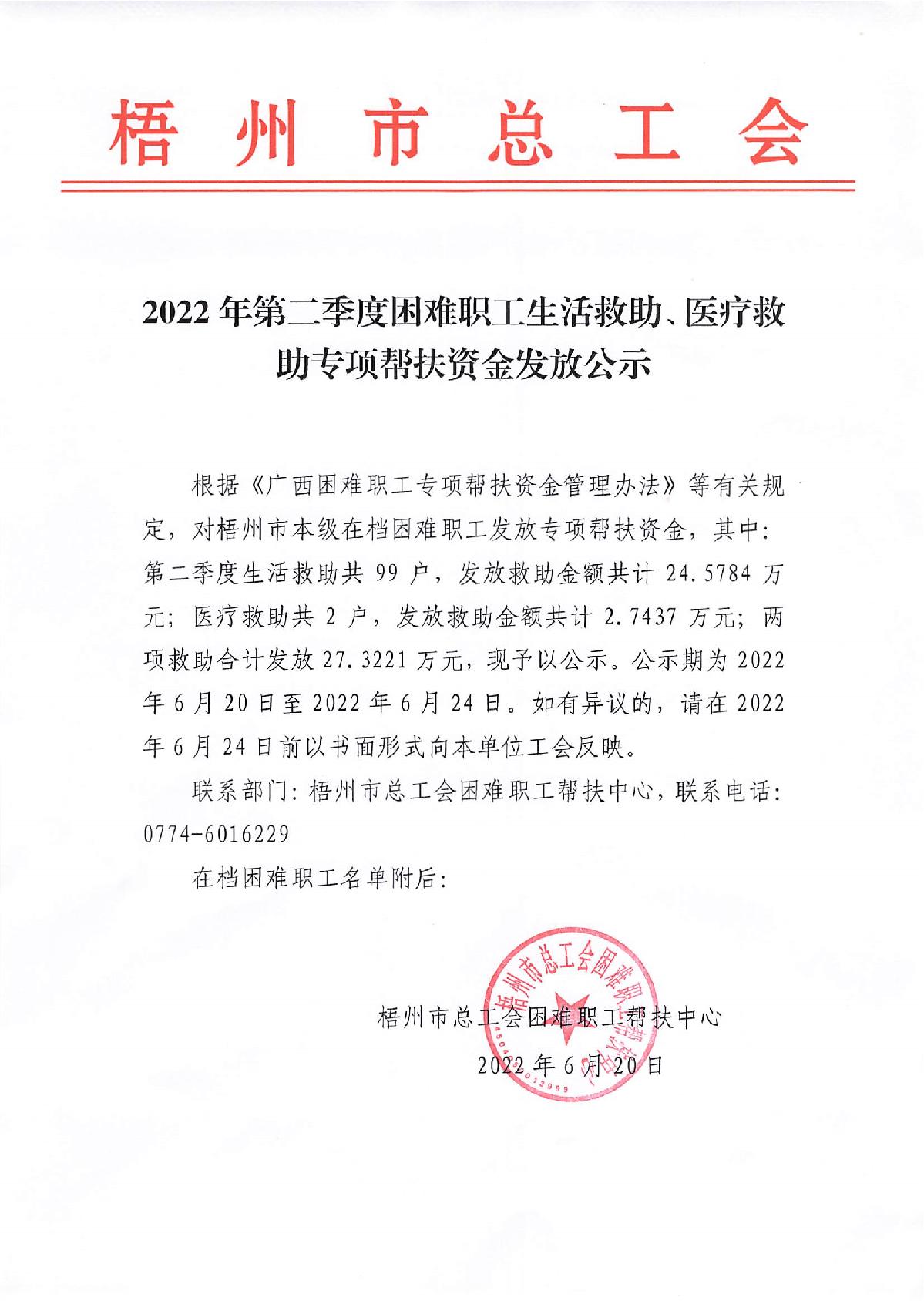 2022年第二季度困難職工生活救助、醫(yī)療救助專項(xiàng)幫扶資金發(fā)放公示
