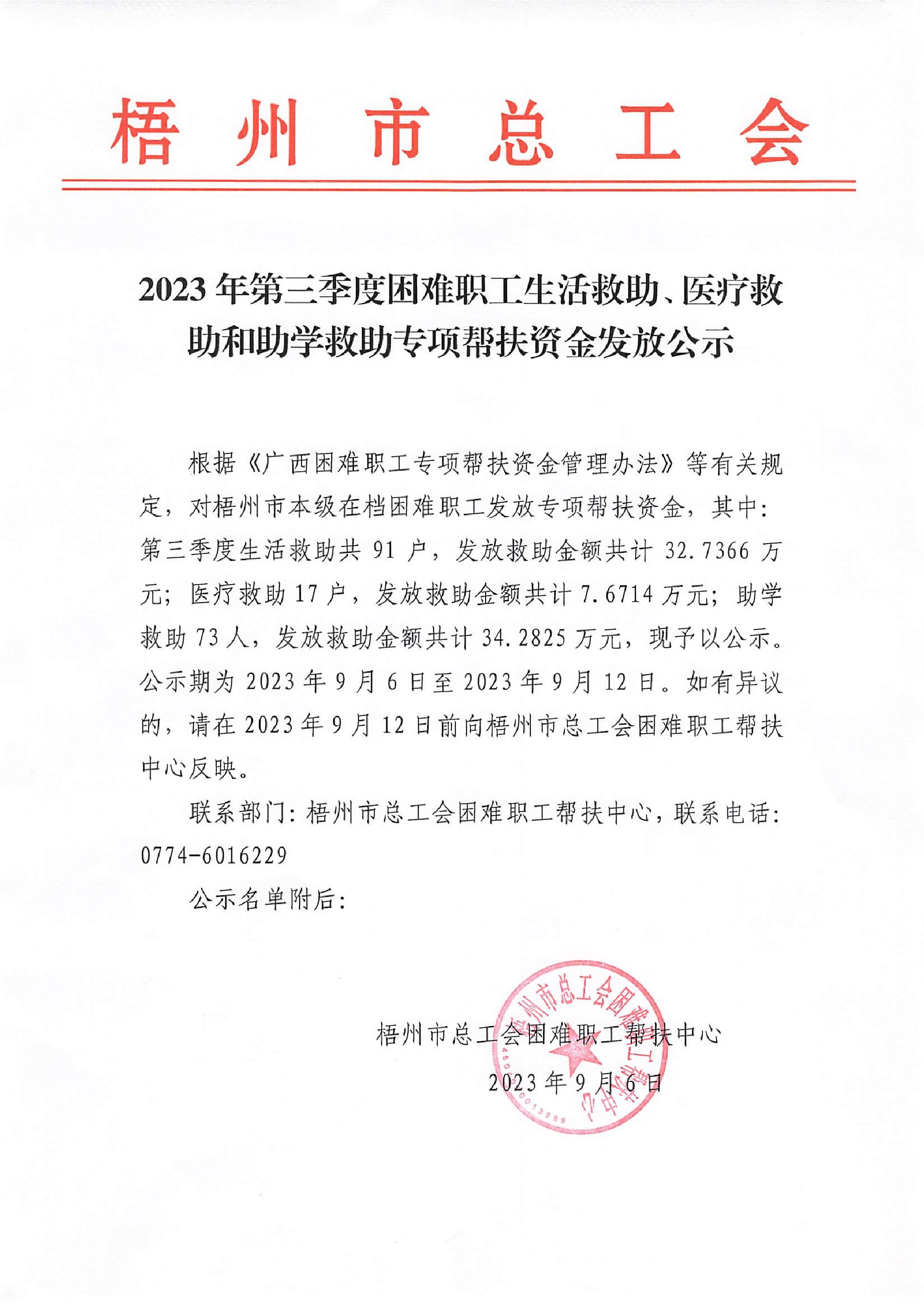 2023年第三季度困難職工生活救助、醫(yī)療救助和助學(xué)救助專項(xiàng)幫扶資金發(fā)放公示
