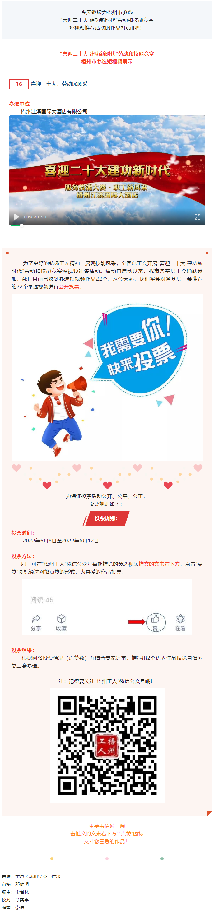 梧州江濱國際大酒店參選作品丨“喜迎二十大 建功新時(shí)代” 勞動(dòng)和技能競賽短視頻投票活動(dòng)開始啦!