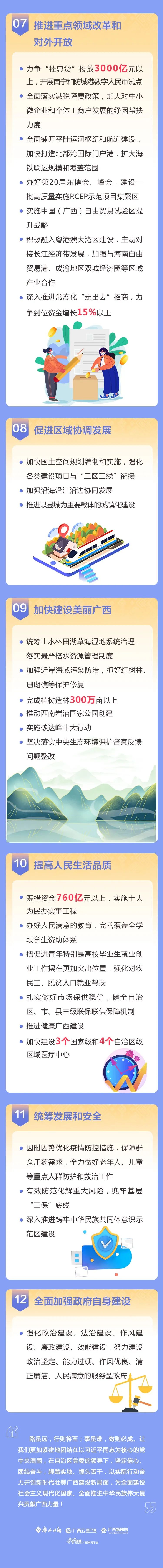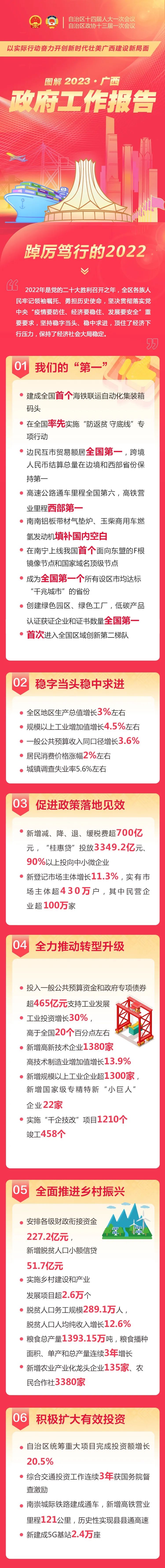1月12日上午9時,廣西壯族自治區(qū)第十四屆人民代表大會第一次會議開幕會在南寧召開。自治區(qū)主席藍(lán)天立代表廣西壯族自治區(qū)人民政府作政府工作報告。 新鮮出爐的政府工作報告,具體有哪些內(nèi)容?廣西日報-廣西云受權(quán)制作圖解《政府工作報告》,帶你看報告! 一組長圖 帶你了解政府工作報告 ↓↓↓